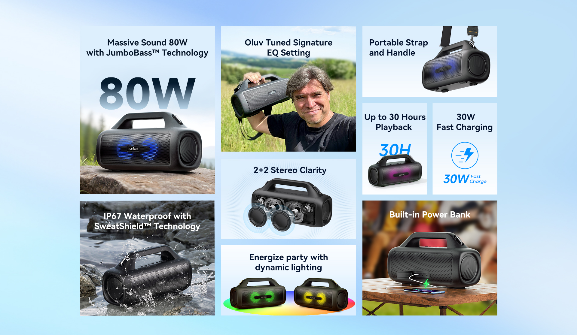• Built-in 80W 4-driver design with Innovate JumboBass™ Technology powerful bass and crisp sound